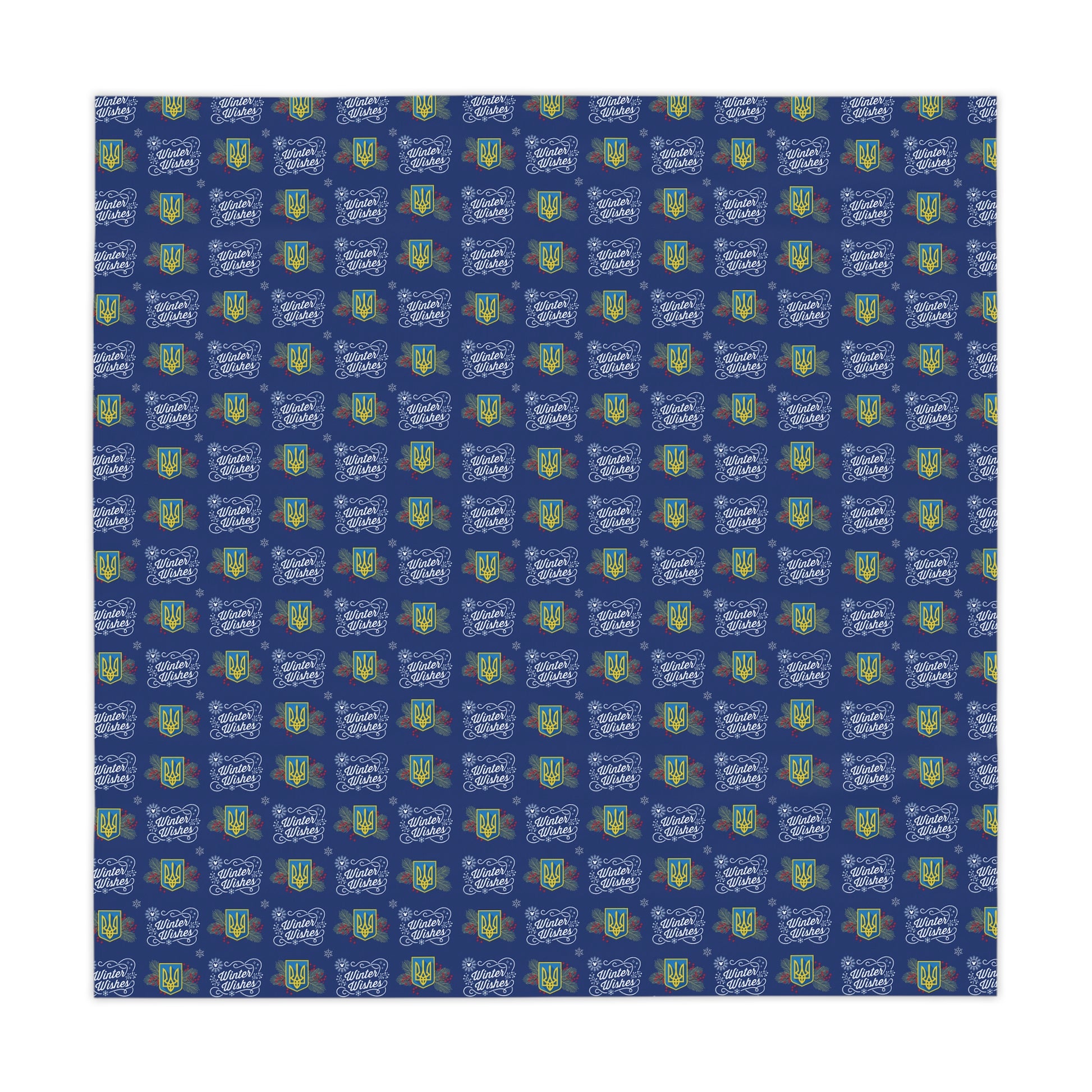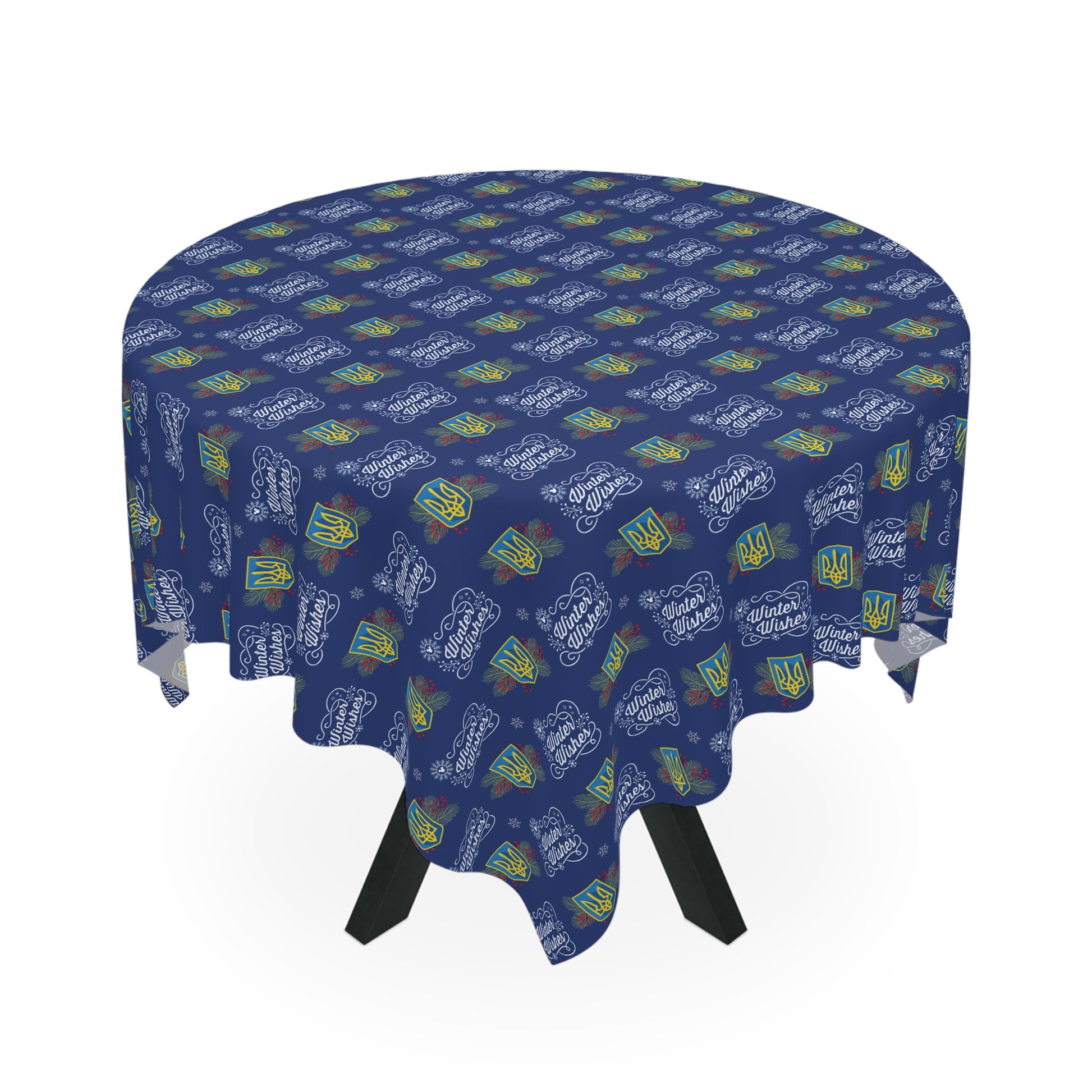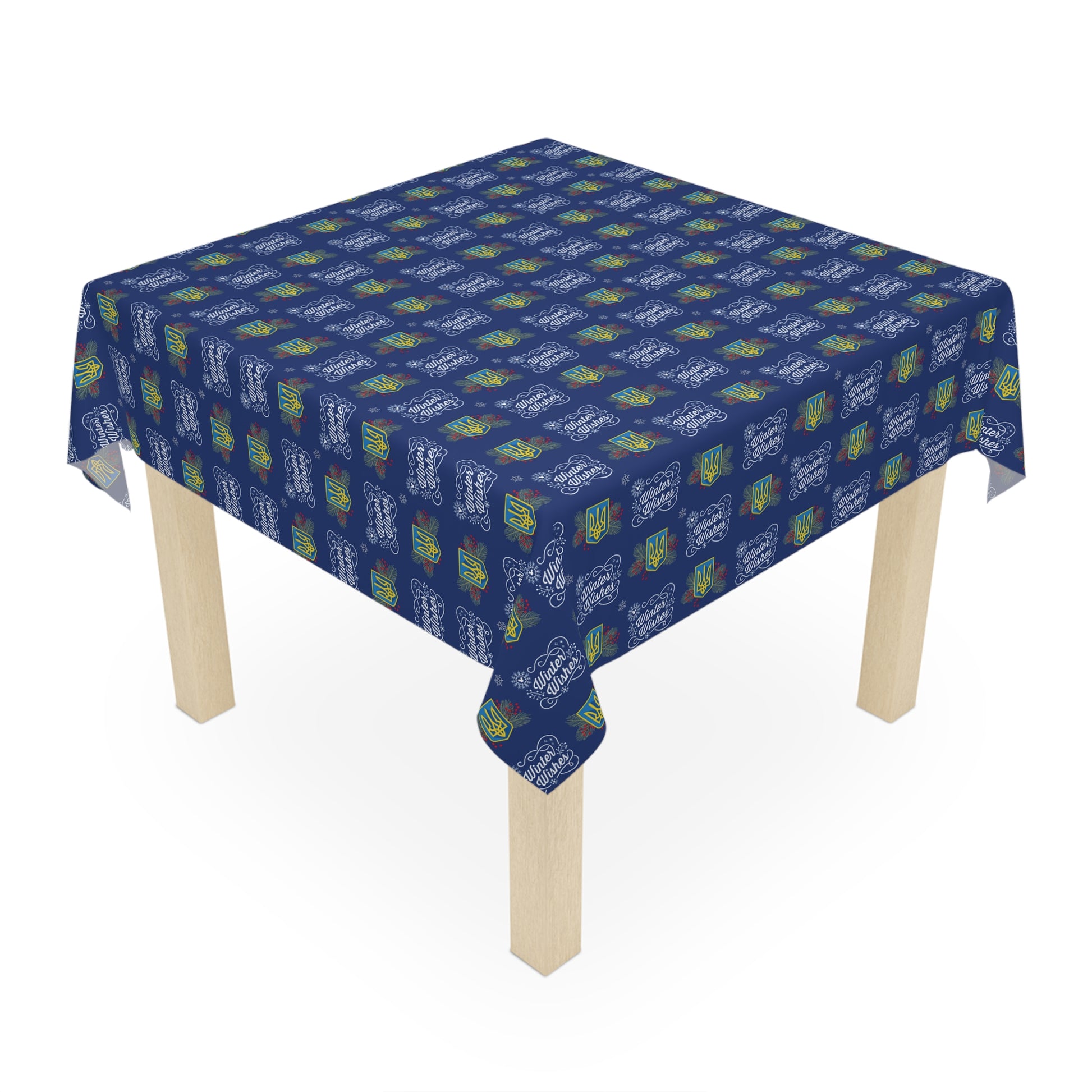 A light, cheerful tablecloth printed edge-to-edge with a repeating pattern of Winter Wishes and Ukrainian Treb.